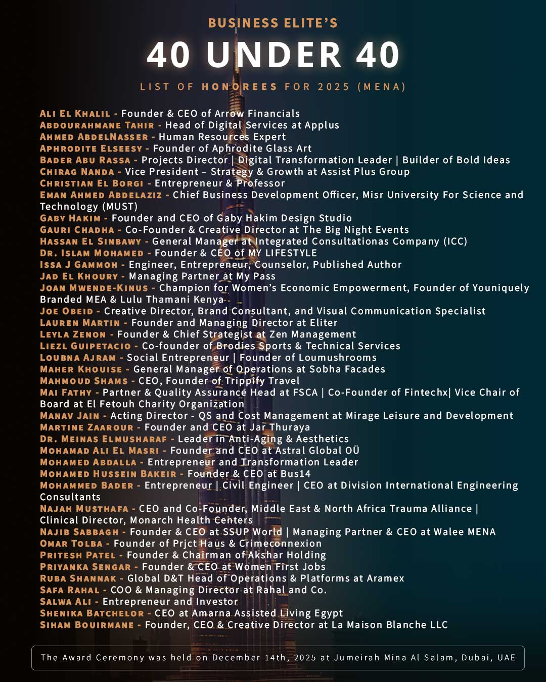 DUBAI, UNITED ARAB EMIRATES, December 23, 2025 /EINPresswire.com/ -- Business Elite Awards brought its prestigious 2025 “40 Under 40” program to an extraordinary close with an exclusive Award Ceremony and Gala Dinner held on December 14, 2025, at the iconic Jumeirah Mina Al Salam in Dubai. The evening celebrated 40 outstanding honorees from across the MENA region, recognizing exceptional young leaders whose vision, innovation, and impact are shaping the future of business.— Viktor Gjorgjieski, PhD, Director at Business Elite Awards